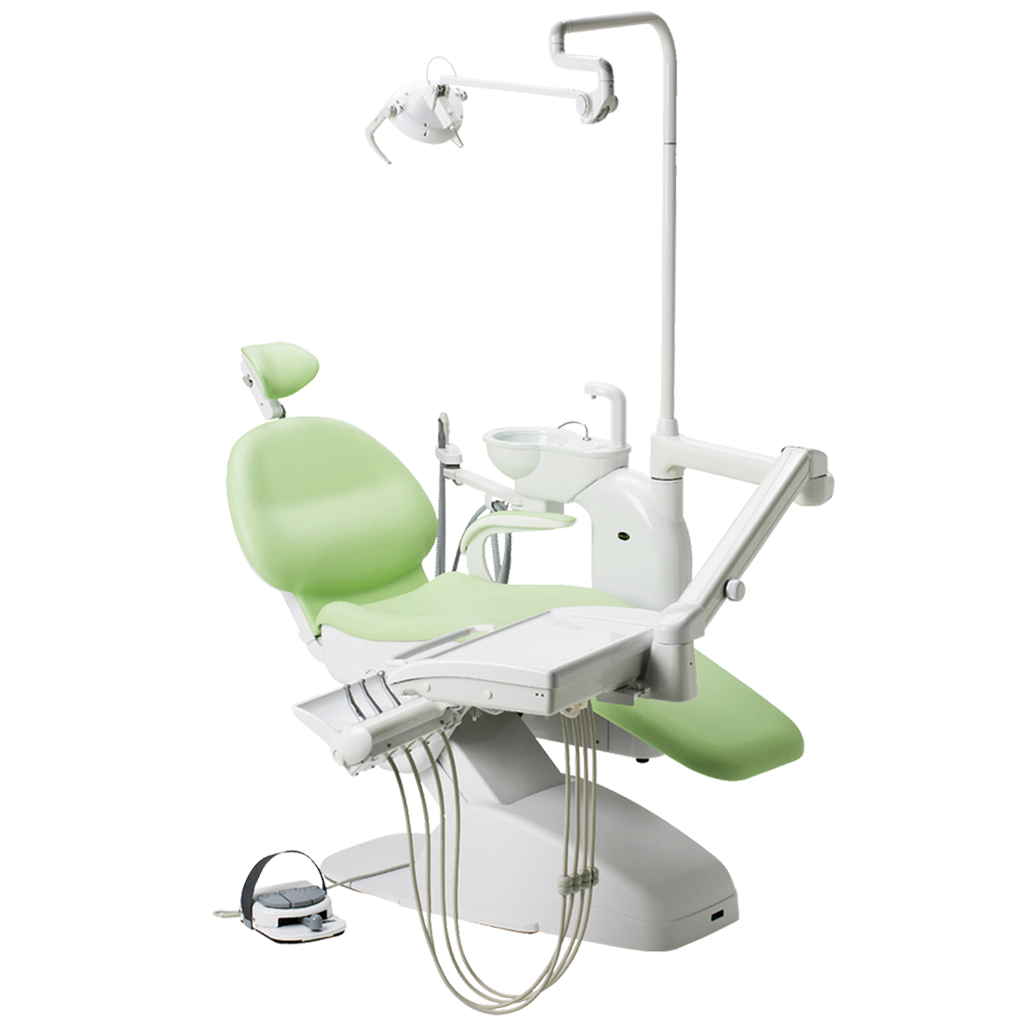 The single lever foot controller has chair control pedals, for hands-free operations of all instruments and fine positioning of motor chair, as well as the spray pedal for turbine and micromotor spray on/off operations. The single foot lever is used for ON/OFF operation plus three stages of the rotation, low, medium and high speeds of the air turbines as well as for chip blowing of the air turbines, ON/OFF operation plus speed adjustments of the micromotor, and ON/OFF operation of the ultrasonic multipurpose instrument.